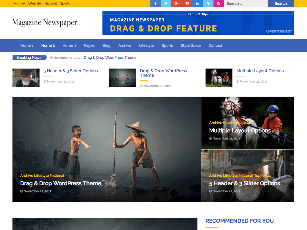 Magazine Newspaper built for newspaper, media, magazine related projects. This theme is a minimalist and fully responsive multipurpose theme with full WordPress Customizer integration, that enables you to customize your website with live preview. This theme is very lightweight and easy to use.